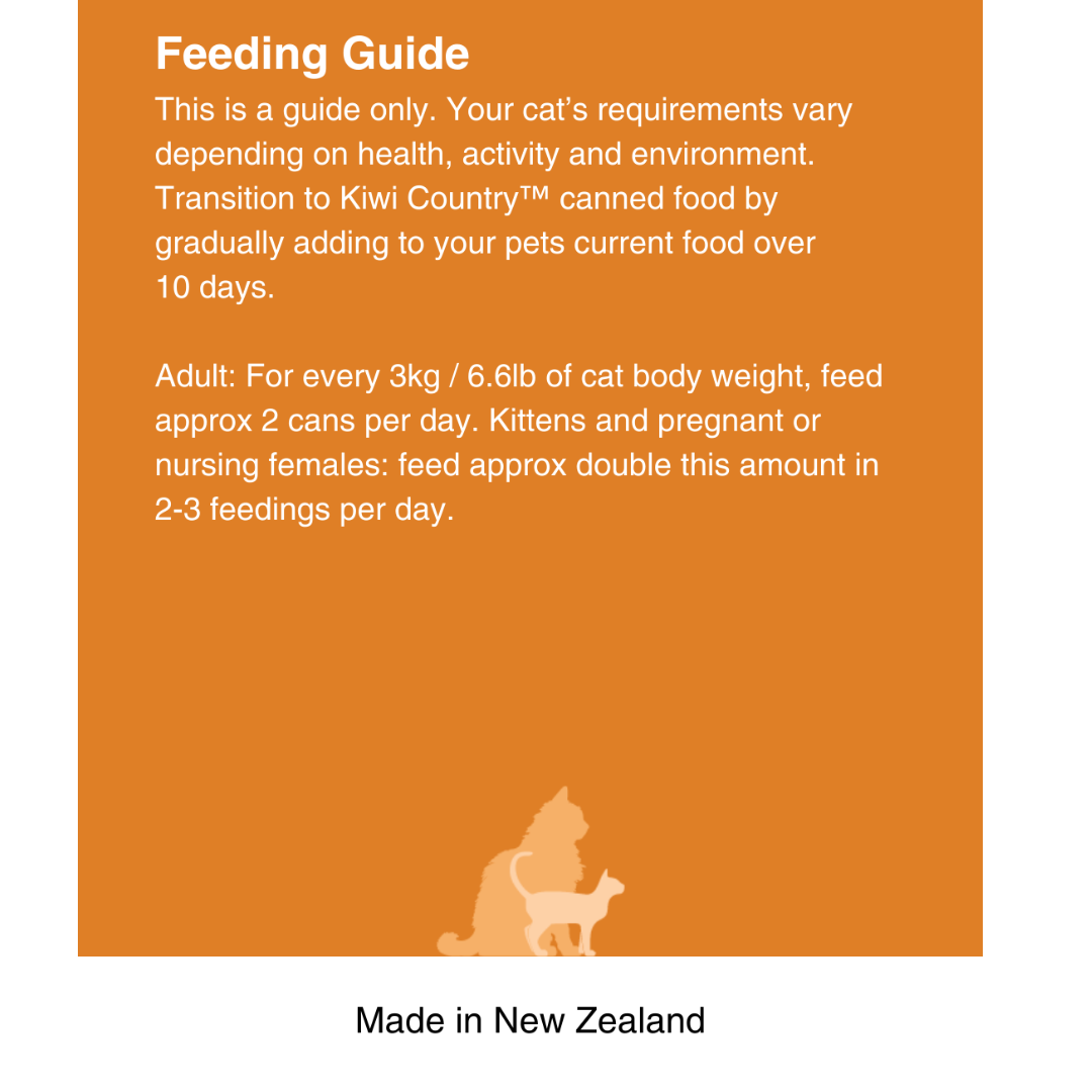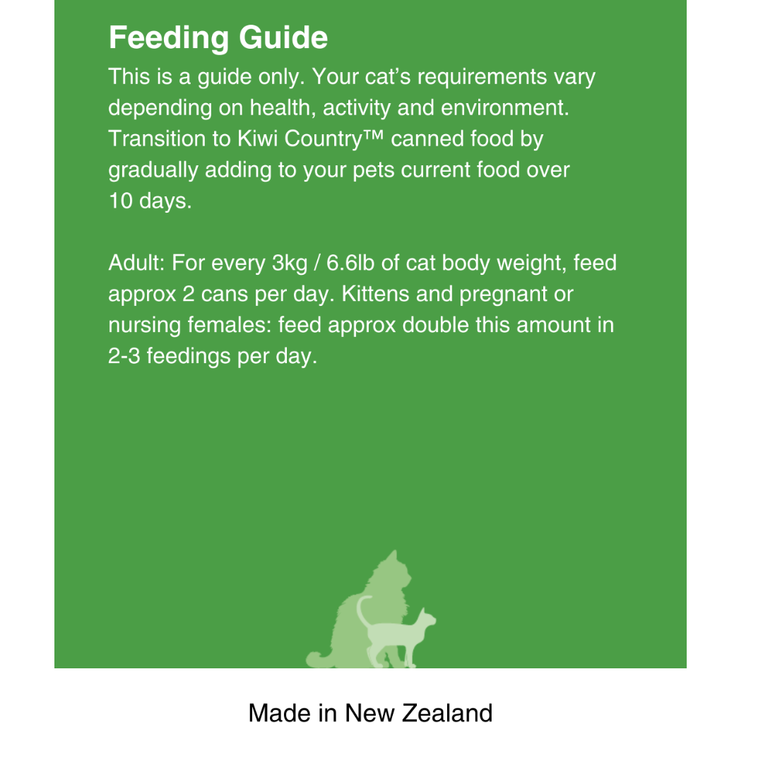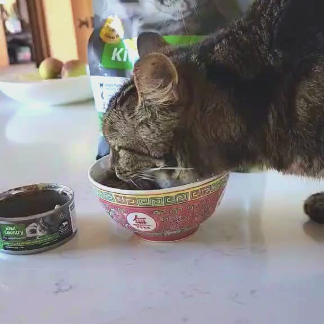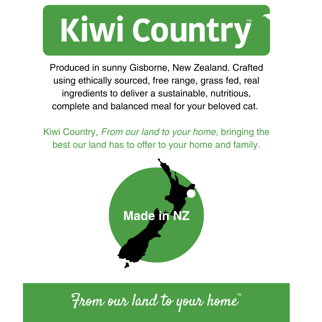 Treat your choosy cat to two of each! Our “Mixed Six” bundle contains 2 of each wet cat food recipe: 2x Kiwi Country™ Grass Fed Beef & NZ Green Mussel Formula Stew, 2x Kiwi Country™ Cage Free Chicken & NZ Green Mussel Formula Stew, 2x Kiwi Country™ Grass Fed Lamb & NZ Green Mussel Formula Stew. Discover their favourite Kiwi Made high meat wet cat food recipe. Complete cat nutrition, formulated for All Cat Breeds, Adults, Kittens and Pregnant or Nursing Females.