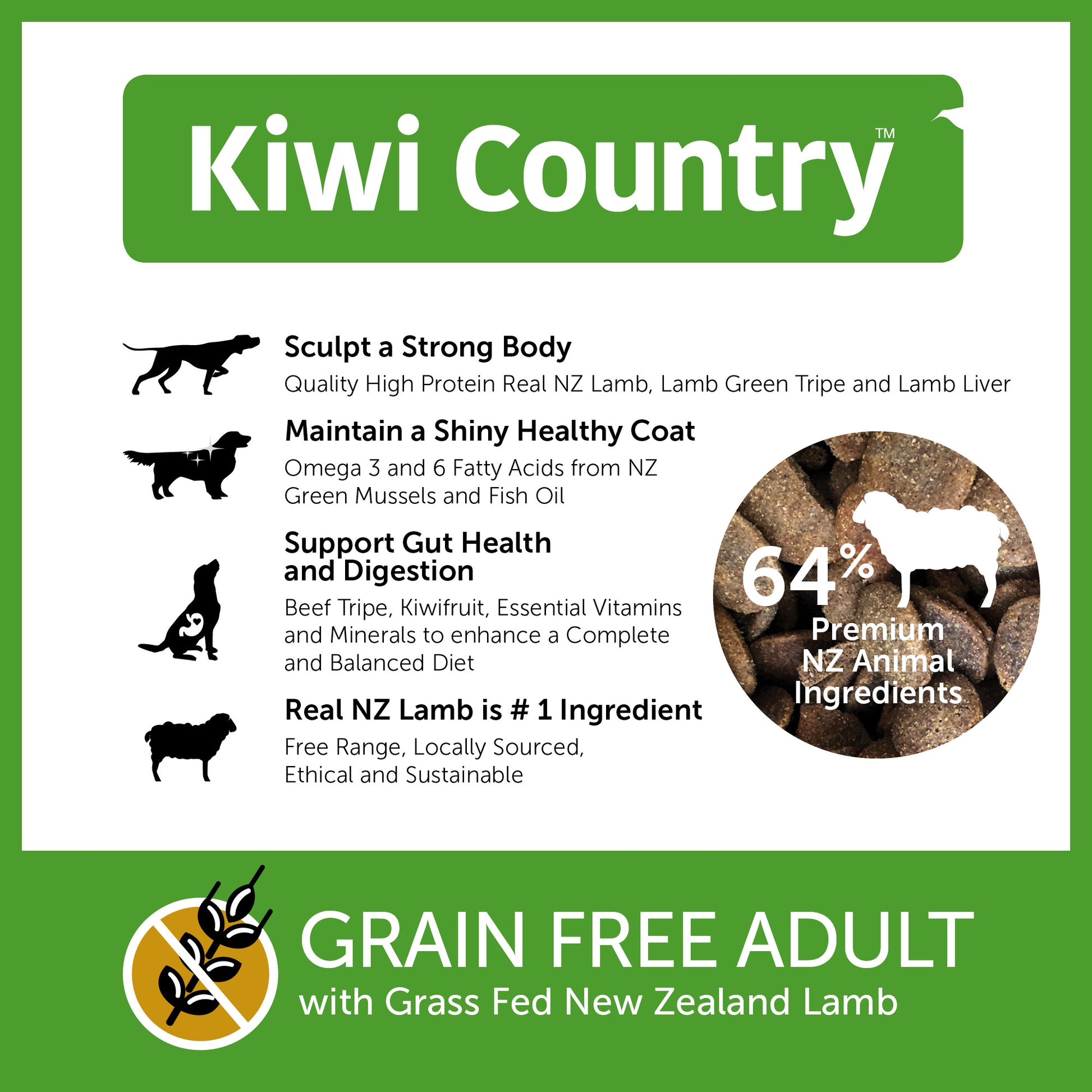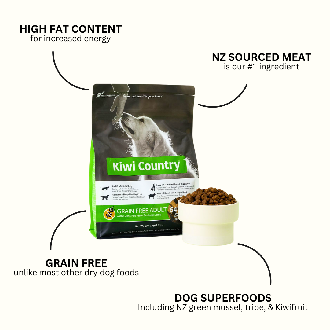 Our Kiwi Country™ Grain-Free Dry Dog Food - Lamb Recipe provides premium nutrition for your canine companion. This kiwi-made formula is made with locally sourced, free-range, grass-fed ingredients, ensuring a sustainable, nutritious, complete and balanced meal. It is the perfect choice for your dog!