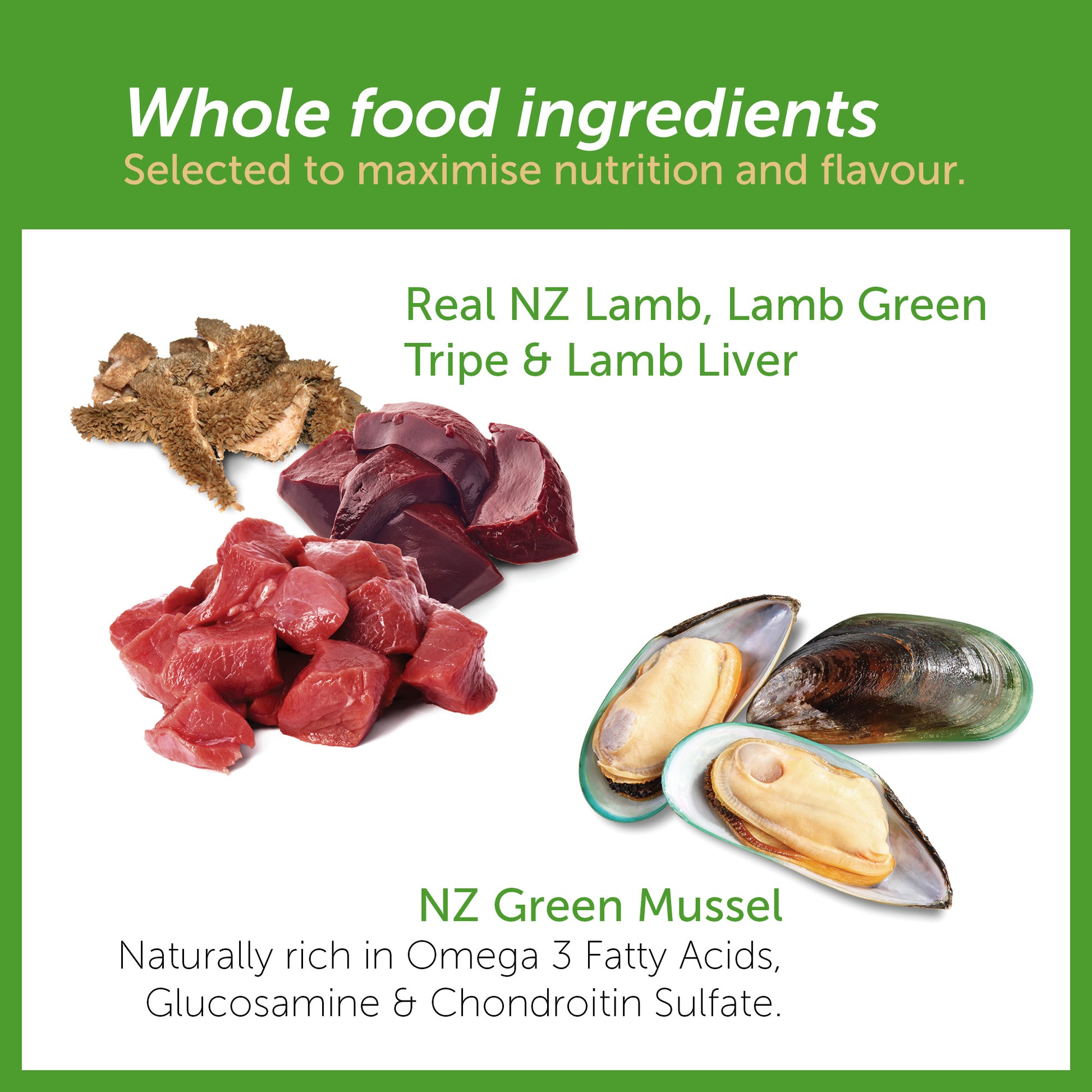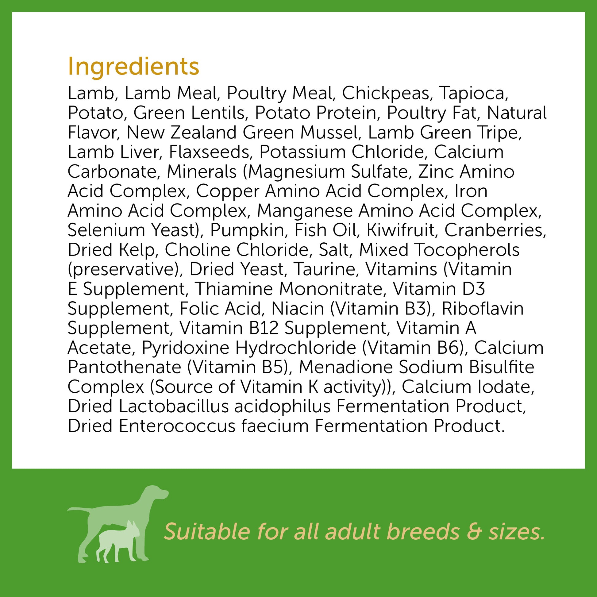 Lamb, Lamb Meal, Poultry Meal, Chickpeas, Tapioca, Potato, Green Lentils, Potato Protein, Poultry Fat, Natural Flavour, New Zealand Green Mussel, Lamb Green Tripe, Lamb Liver, Flaxseeds, Potassium Chloride, Calcium Carbonate, Minerals (Magnesium Sulfate, Zinc Amino Acid Complex, Copper Amino Acid Complex, Iron Amino Acid Complex, Manganese Amino Acid Complex, Selenium Yeast), Pumpkin, Fish Oil, Kiwifruit, Cranberries, Dried Kelp, Choline Chloride, Salt, Mixed Tocopherols (preservative), Dried Yeast, Taurine, Vitamins (Vitamin E Supplement, Thiamine Mononitrate, Vitamin D3 Supplement, Folic Acid, Niacin (Vitamin B3), Riboflavin Supplement, Vitamin B12 Supplement, Vitamin A Acetate, Pyridoxine Hydrochloride (Vitamin B6), Calcium Pantothenate (Vitamin B5), Menadione Sodium Bisulfite Complex (Source of Vitamin K activity), Calcium Iodate, Dried Lactobacillus acidophilus Fermentation Product, Dried Enterococcus faecium Fermentation Product.